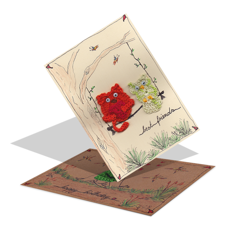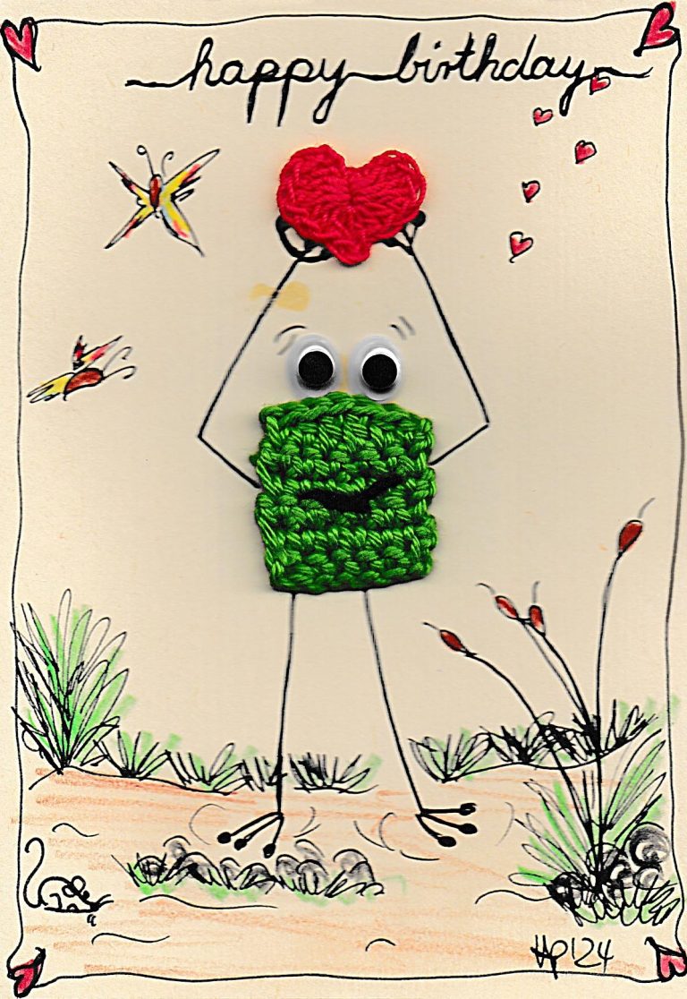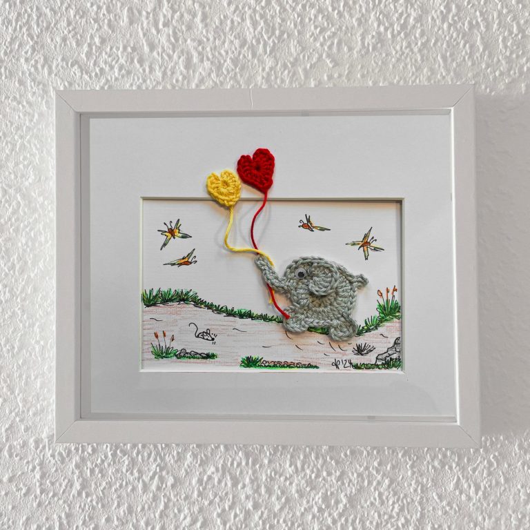 Alle meine Motive sind eigene Kreationen. Die Zeichnungen werden handcoloriert und mit Häkelelementen ergänzt. Dadurch wird jedes Stück ein echtes Unikat – egal ob als individuelle Klappkarte für besondere Anlässe oder dekorativ im Bilderrahmen als Wandschmuck.